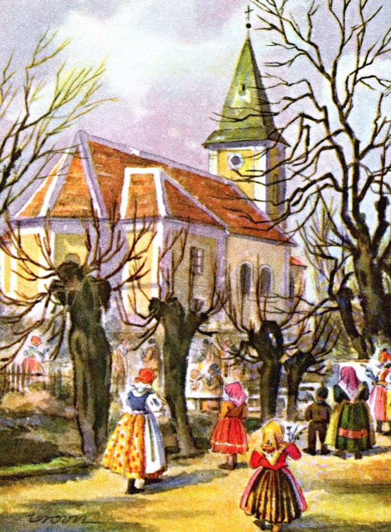 vyobrazení: ilustrace z knihy Rok na vsi, malíř František Vrobel (1892, Zábřeh, Ostrava – 1953, Kroměříž). Kostel je v Divákách u Klobouk