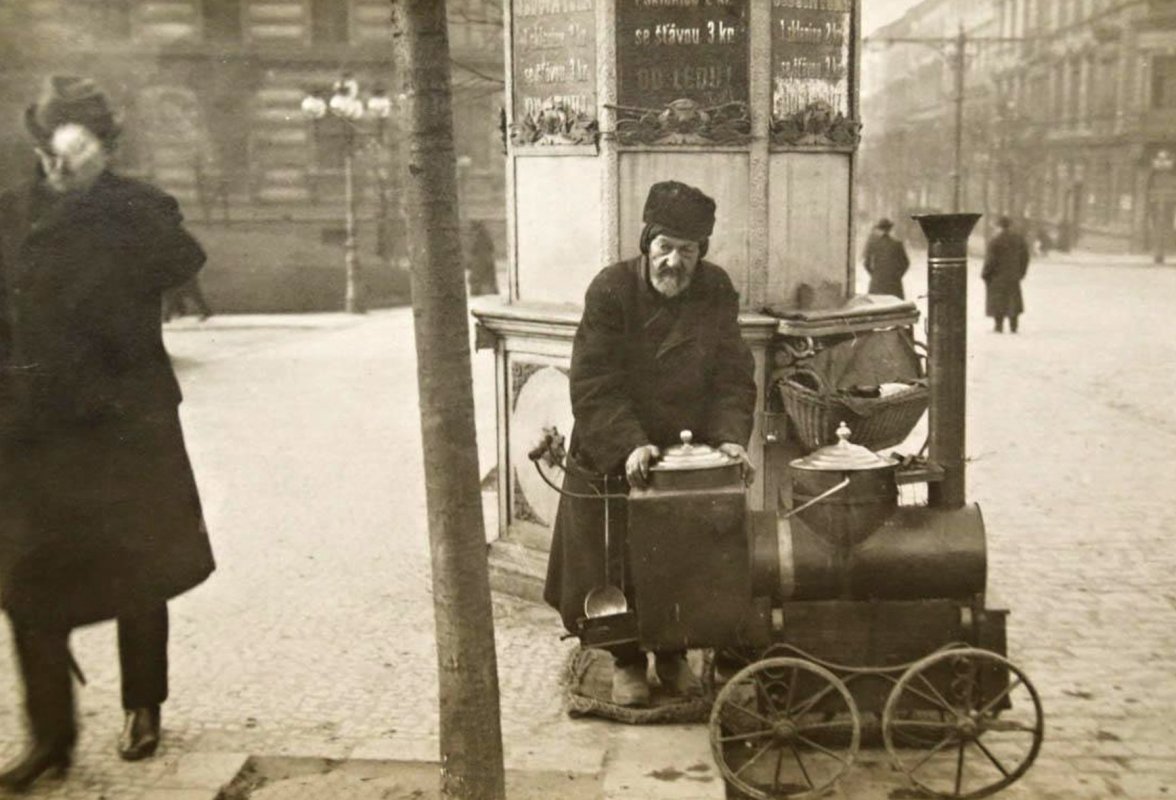 Nejen kalendář, také všelijaké pouliční jevy odedávna věštily pražským obyvatelům střídání ročních období. Některé vytrvaly po dnešek (1925), jiné navždy vymizely a s některými jste se vždy rádi shledávali. Bylo např. na počátku adventu, drobounké sněhové chmýří se snášelo z šedivé oblohy, vy jste kráčeli některou hlavní třídou nebo po Václavském náměstí a tu o váš nos zavadil pach řeřavého (rozžhaveného) dřevěného uhlí, s nímž se mísila a převládala jakási teplá, sladká a jakoby chlebovitá vůně. Zdaleka ji vašemu čichu přinášel závan větru. Ještě chvíli trvalo, než se vám zjevil zdroj tohoto povědomého pozdravu nastávající zimy. Tu na nároží ulice Havířské nebo u Prašné brány, nebo zase naopak u paláce Šlikova či Lažanského choulila se babka, choulil se šedivý děda nad skrovnými kamínky, z jejichž mosazné poklice ventilem opatřené unikala modrá pára a silná ta vůně.