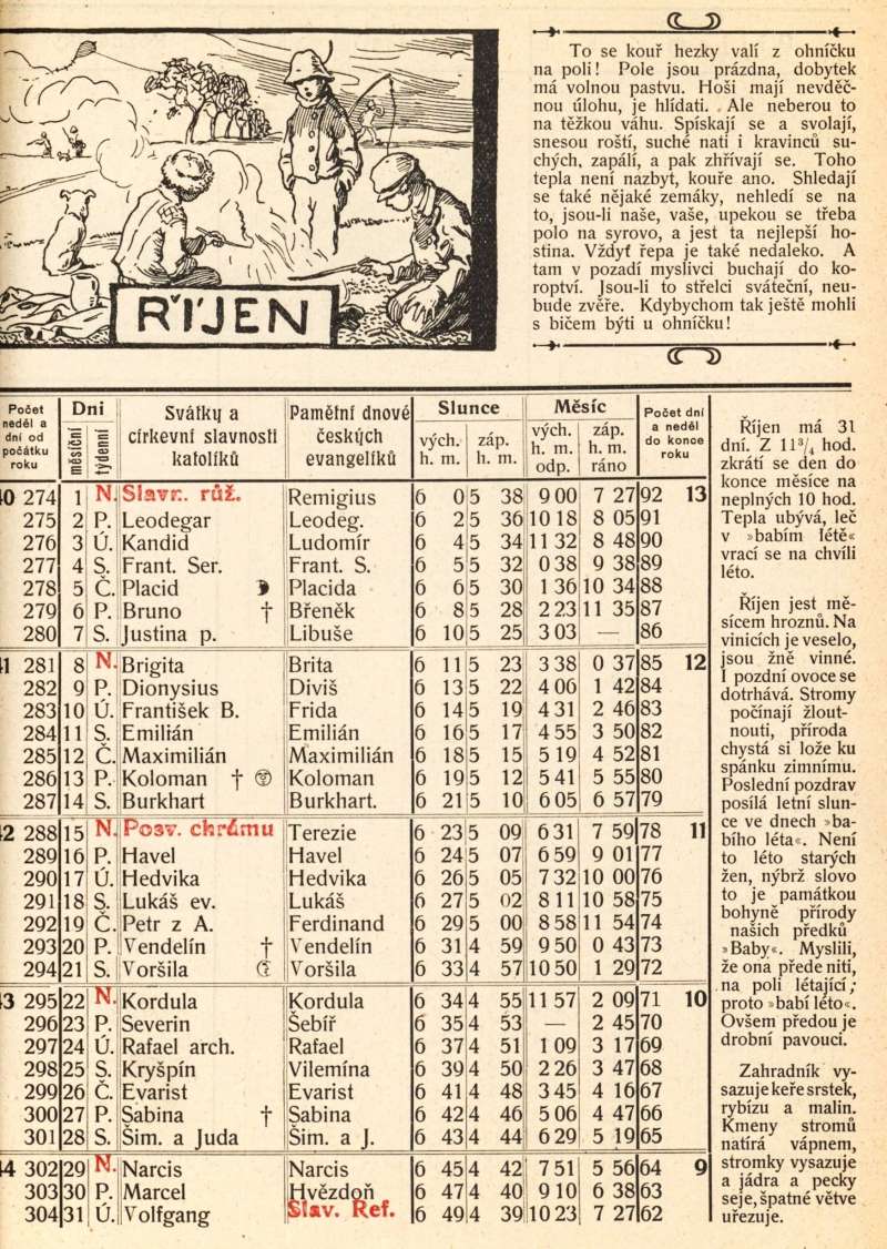 Říjen byl měsícem, kdy končila sklizeň na poli a s tím také byla spojená jedna z největších podzimních dětských radovánek, rozdělávání ohníčků. Dobový text k obrázku tuto chvíli popisuje: „Kouř se hezky valí z ohníčku po poli, které je prázdné a dobytek má volnou pastvu. Hoši mají nevděčnou úlohu, neboť ho musí hlídat, ale nedělají si s tím příliš těžkou hlavu. Pískáním se svolávají, snášejí roští, suchou nať i kravince. Po zapálení se ohřívají, je sychravo a padá mlha. Tepla není nazbyt, kouře ano. Našli i nějaké zemáky, nehledí na to, jsou-li naše nebo vaše, prostě je upečou a pak je to ta nejlepší hostina. V pozadí stojící myslivci bouchají do koroptví. Jsou-li to střelci sváteční, zvěře neubude. Přichází tma a přání dětí je jediné, kdybychom tak ještě mohli býti s bičem u ohníčku!“ (1905)