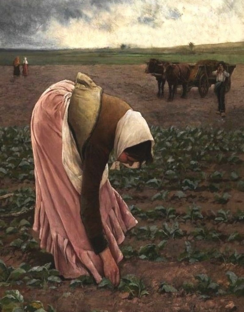 vyobrazení: obraz, autor: Václav Brožík (1851, Třemošná –1901, Paříž), Na obrazu Václava Brožíka z roku 1899 mladá vesničanka zvedá ruce k hlavě. Stojí uprostřed pole před hromadou řepy a protahuje si ztuhlá záda. Obraz 2, autor: Josef Schikaneder (1855, Praha – 1924, Praha)