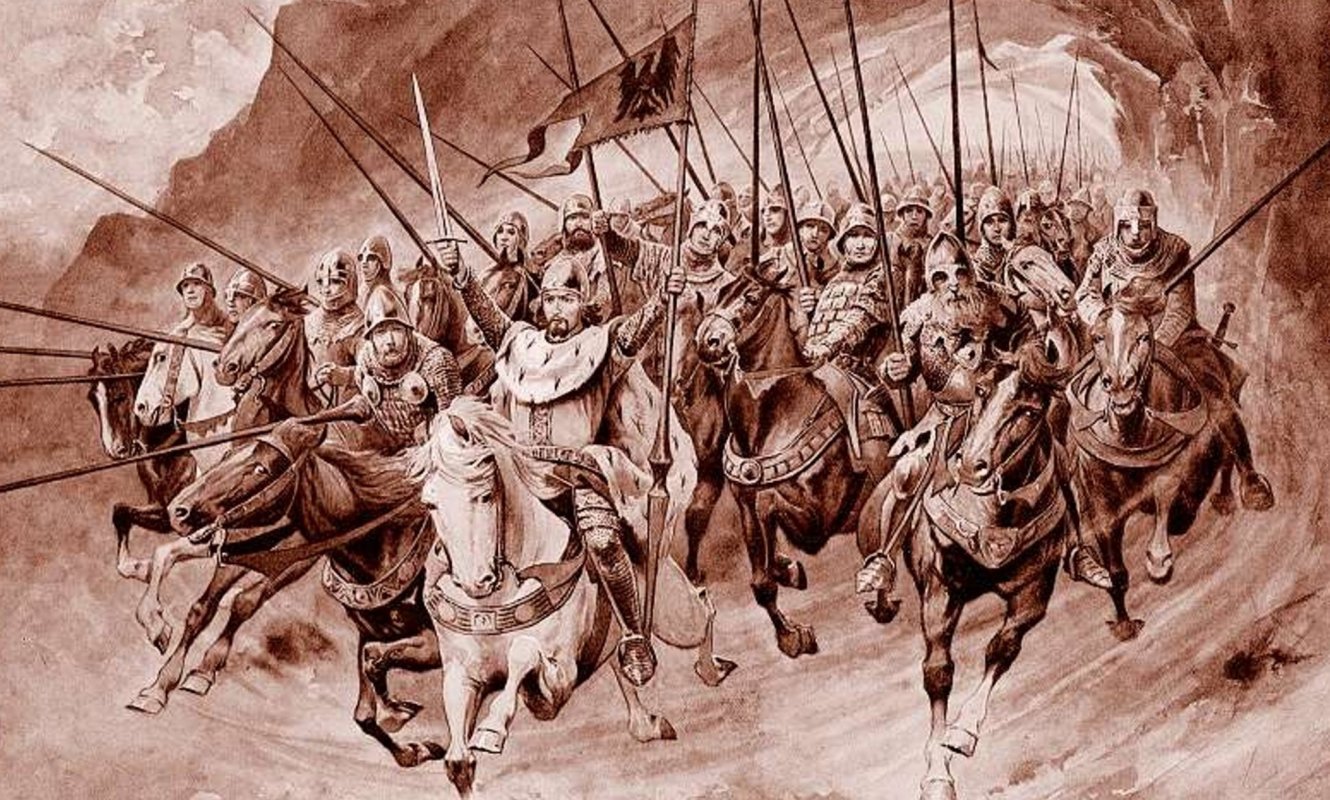 vyobrazení: pohlednice, autor neznámý. Obraz: Věnceslav Černý (1865, Staré Benátky - 1936, Mladá Boleslav), Svatý Václav vyjíždí v čele blanických rytířů z hory, 1898
