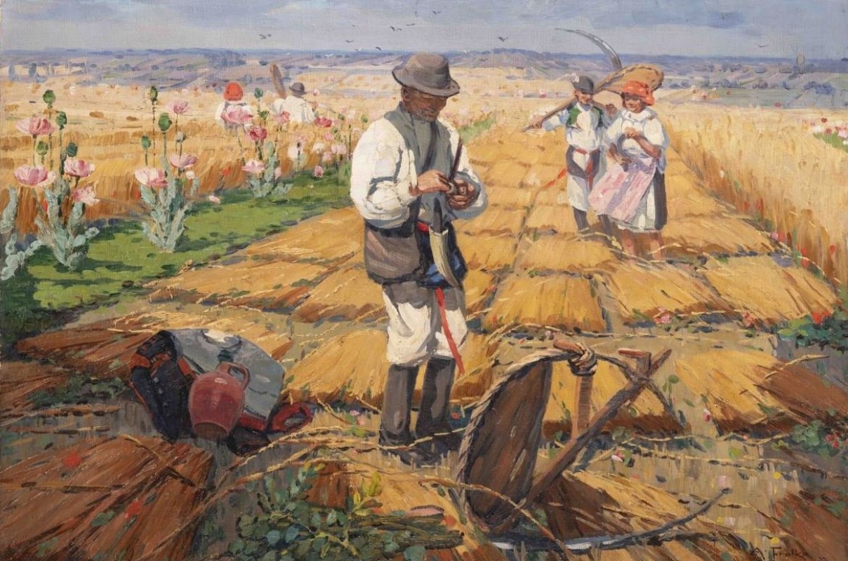 Rolník zasadil semeno, které v krátké době vyklíčilo a rostlo obilí jemuž věnoval po celou dobu vzrůstu velikou péči, kterou podporoval mnohými pověrčivými praktikami, které se po generace dědily. Po celou dobu zrání obcházel pole a starostlivým pohledem sledoval, zda neutrpělo nějaké úhony. Denně s obavami sledoval oblohu a srdce mu úzkostlivě bilo, nakupily-li se zlověstné mraky, hrozící zničením celoroční námahy.