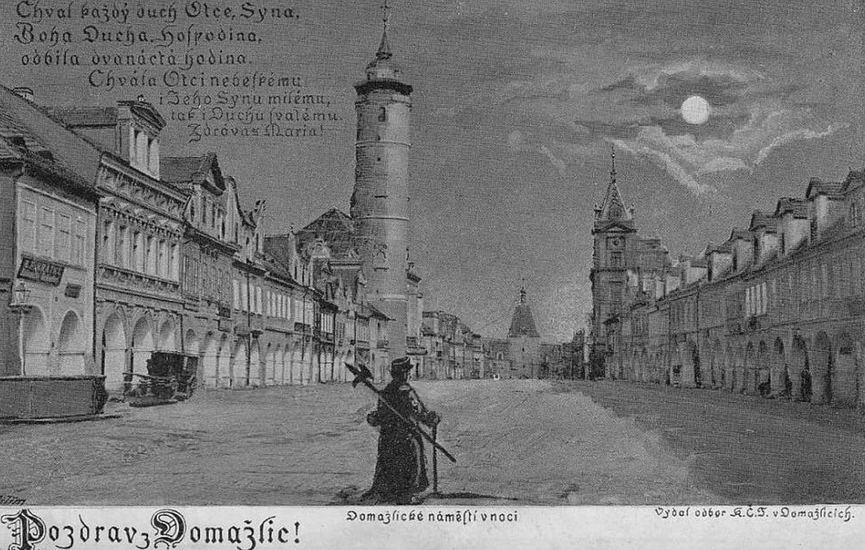 vyobrazení: ilustrace, autor neznámý, l. p. 1879 a pohlednice: pozdrav z Domažlic