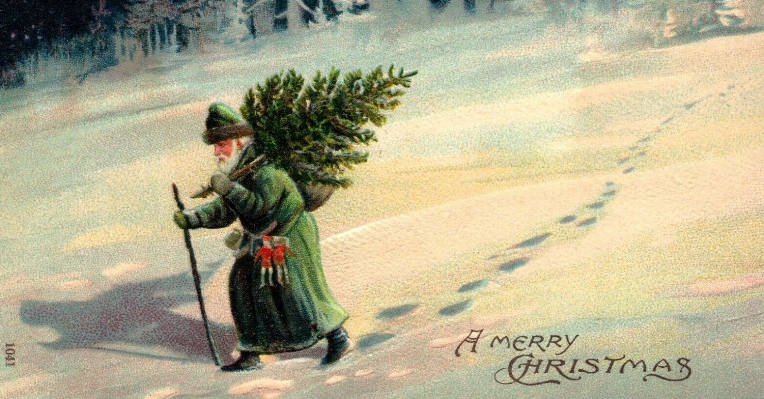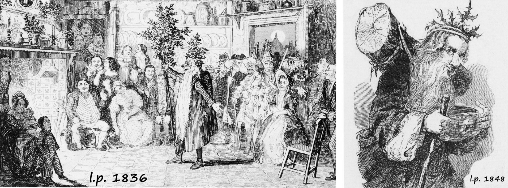 1847 - vyobrazení Otce Vánoc z roku 1848 s cesmínovým věncem, holí a mísou na kořalku a s vánočním polenem v ruce